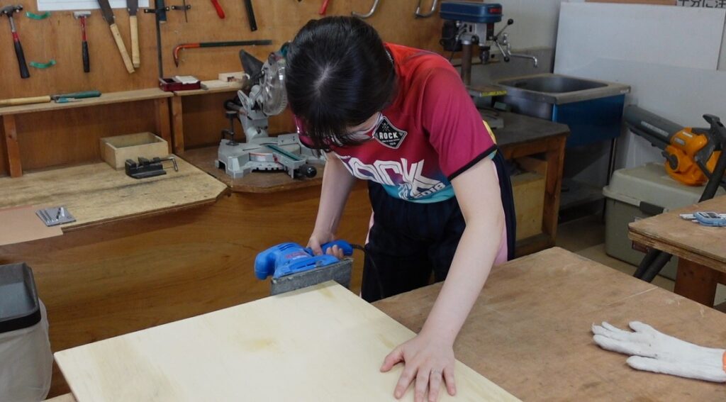最後に、カットしたところや板の表面はザラザラしてて危ないので、サンダーを使って表面や断面を滑らかにしていきました。サンダーは研磨する工具なのでケガのリスクは少なくて安心して使用できます(笑)