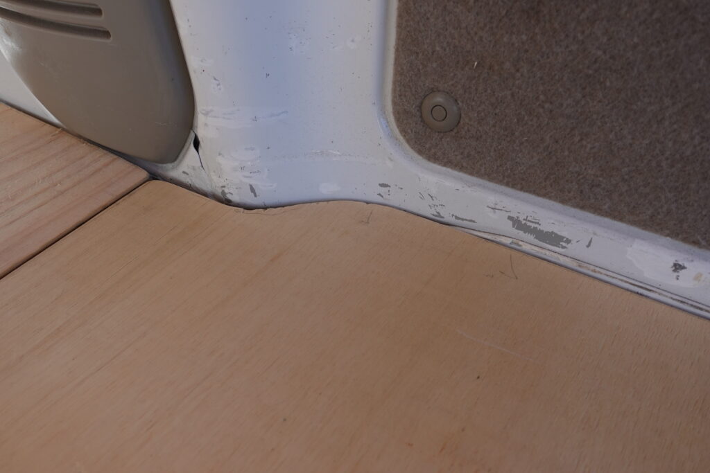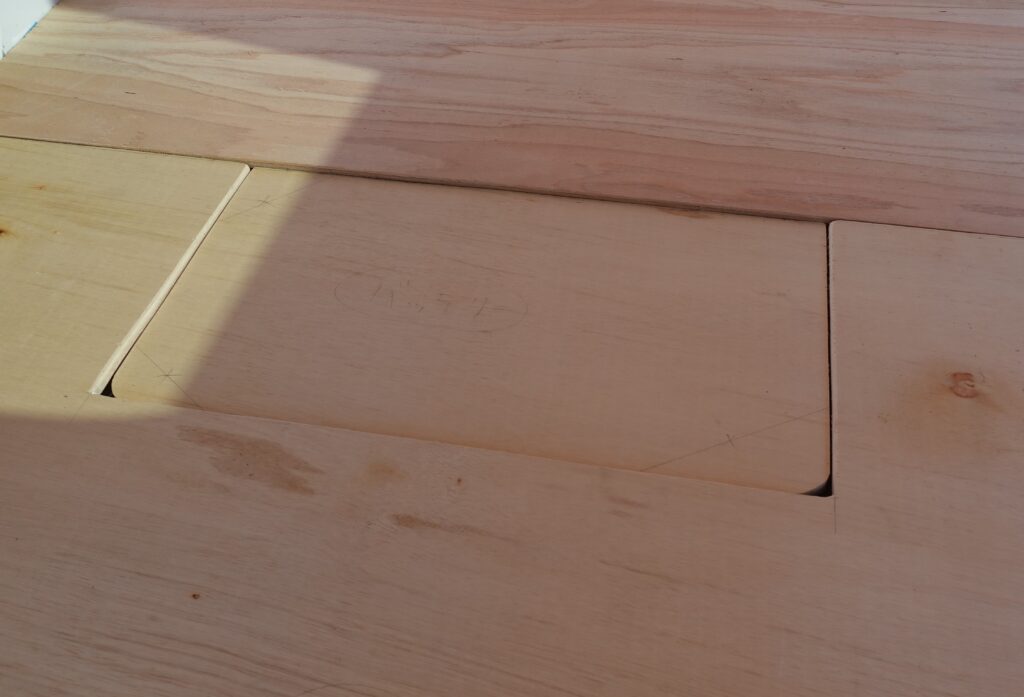 実はこの後部座席部分の床板は、DIYの最中にヒビが入って壊れてしまったため、一度作り直しました。原因は角材の位置が両端に寄り過ぎていたことで、床板に乗った時に中心に負荷がかかったと思われます。