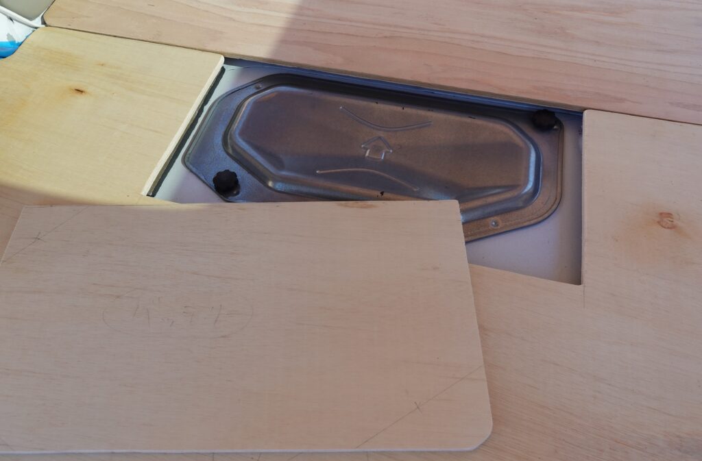 メインバッテリー部分のところは、もしものことがあった時にすぐ開けられるように床板を切り抜いて蓋のようになってます。