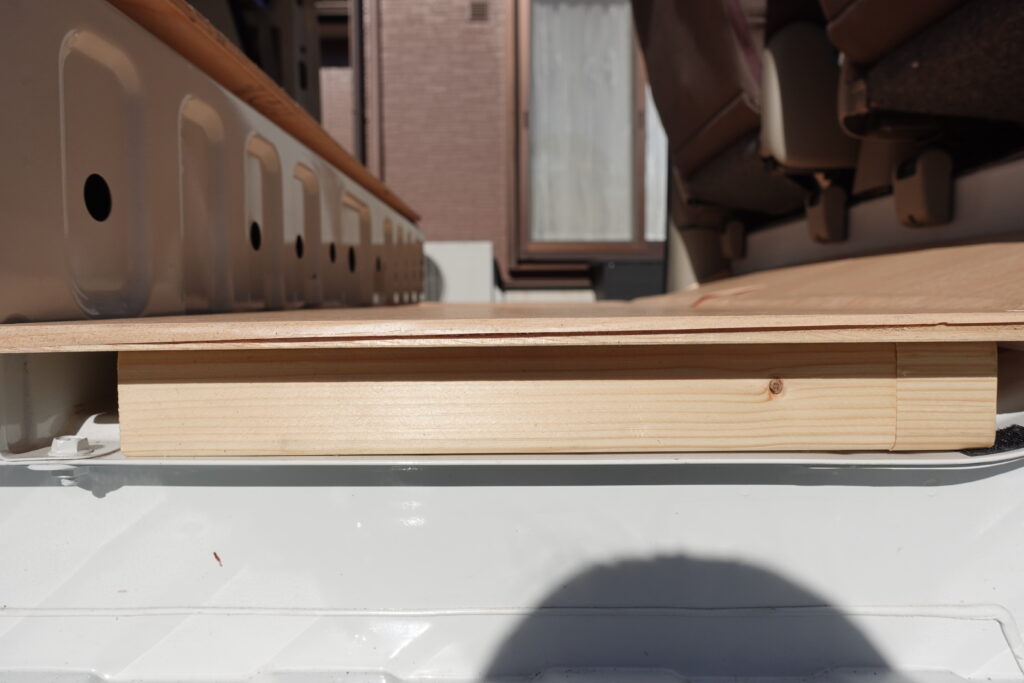 後部座席のあった場所は傾斜になっており、運転席側に行くにつれてだんだん高くなっている造りでした。なので荷室側の底に角材を置いて底上げし、高さを調整することで平衡を保つようにしました。